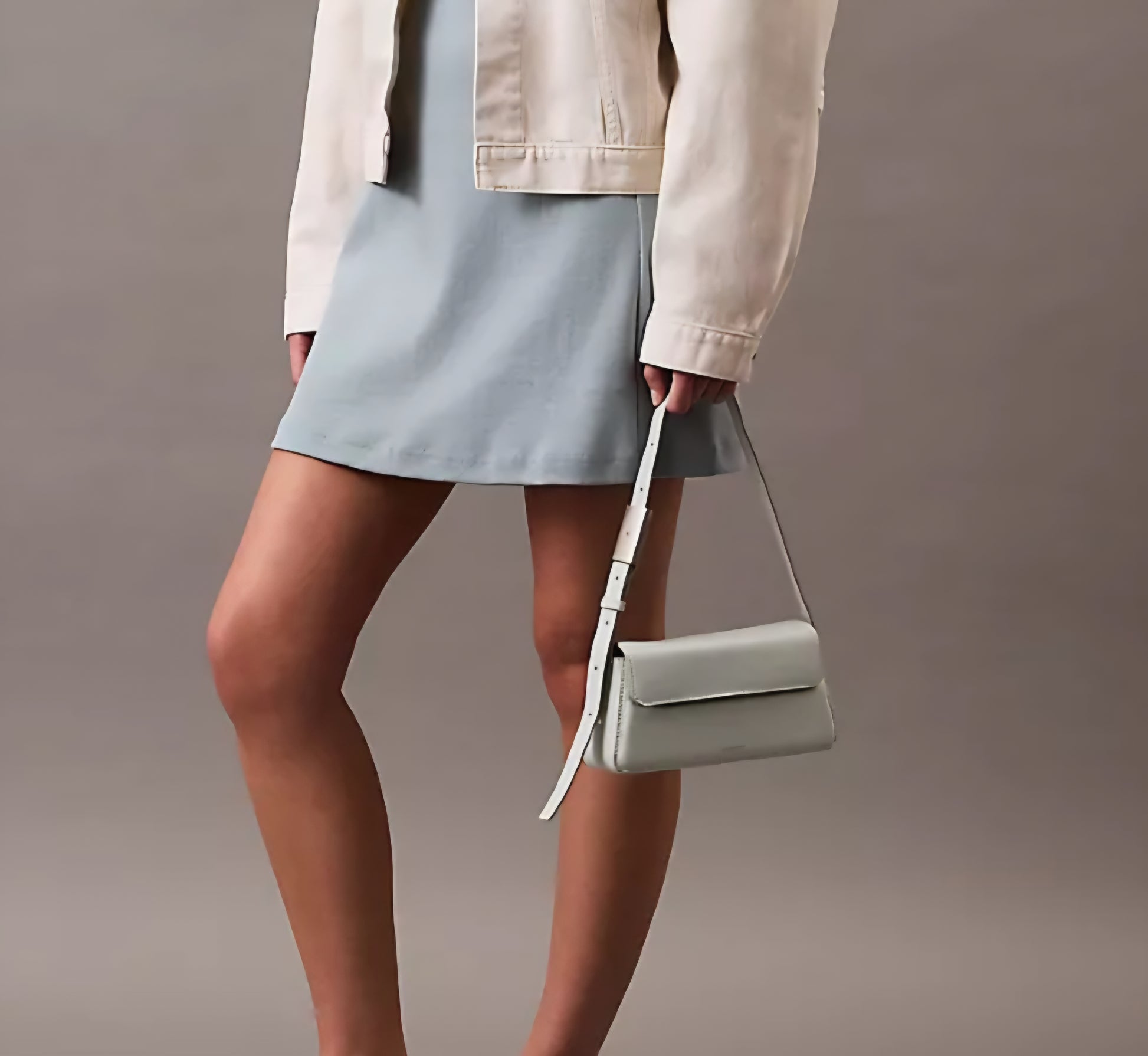 Calvin Klein handbag in white with a minimalist and sophisticated design. Features top flap closure, adjustable shoulder strap with metallic detail, and subtle front logo. Approx. size: 9.3" W x 4.7" H x 2.4" D. Perfect for a modern and versatile look.