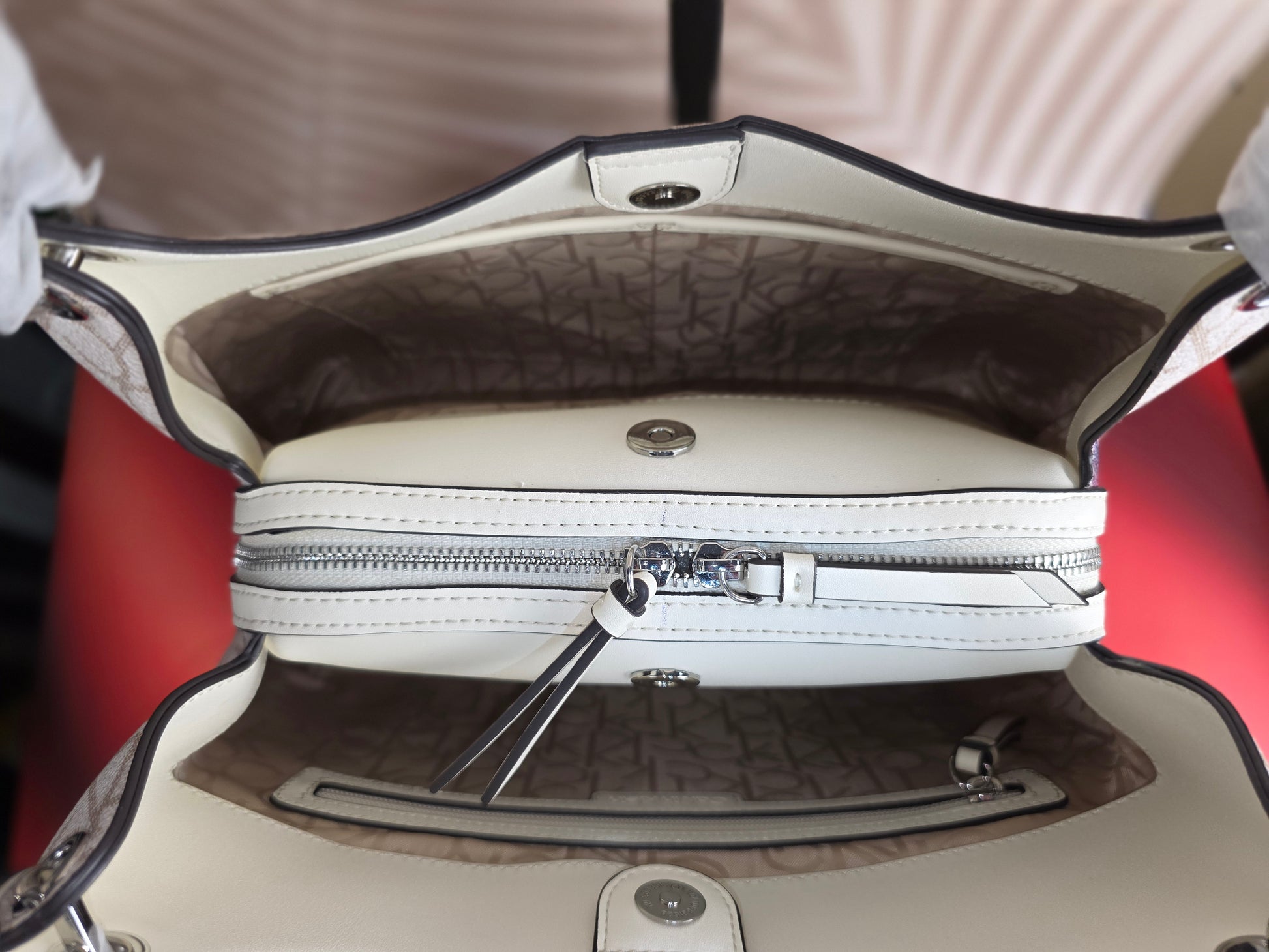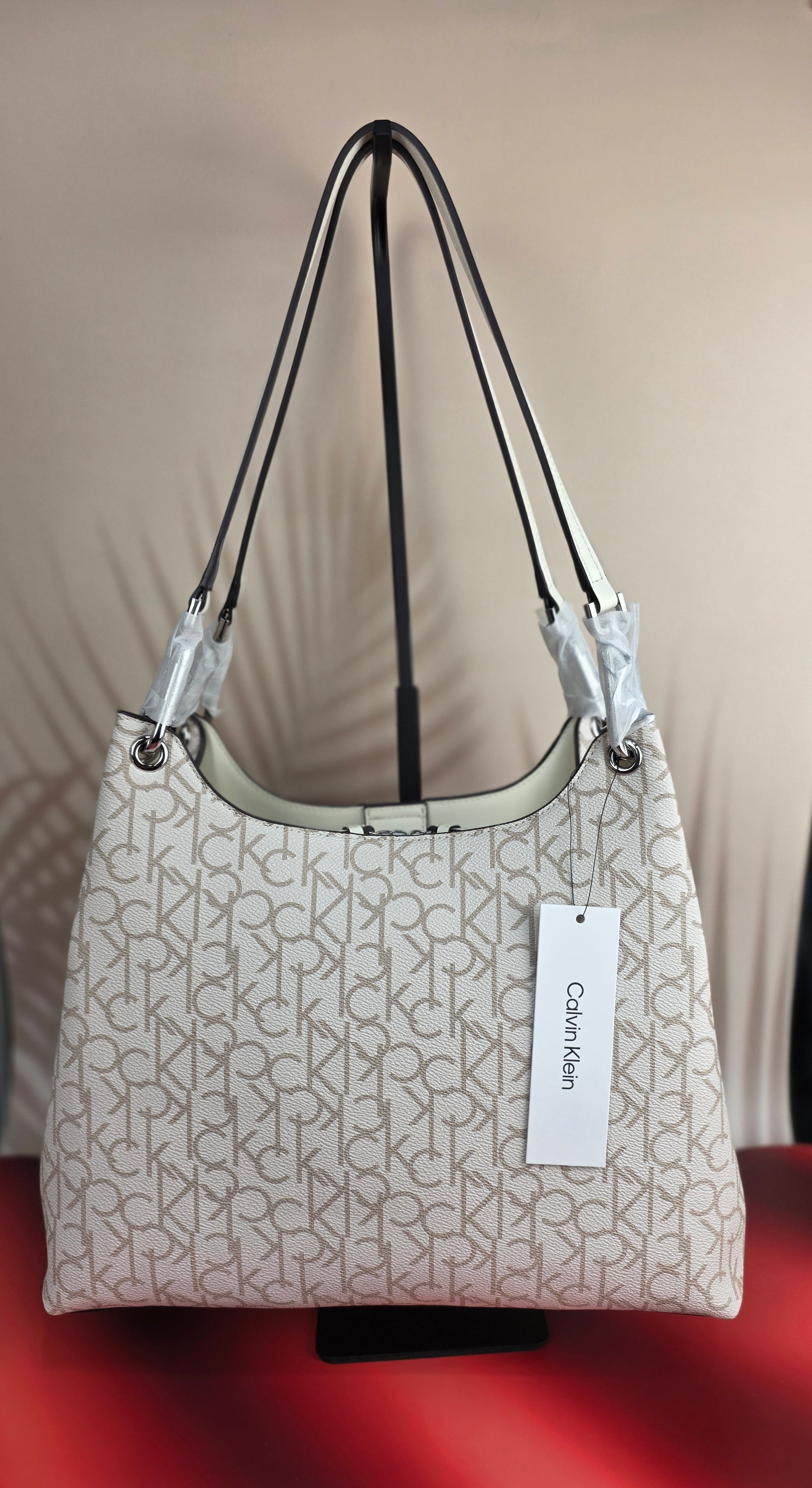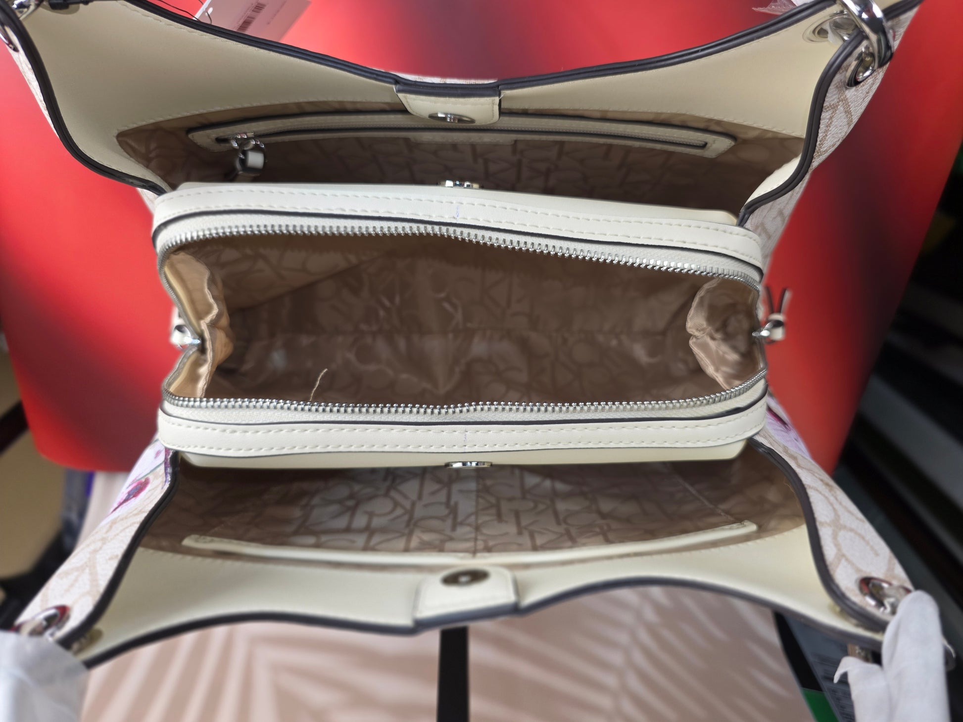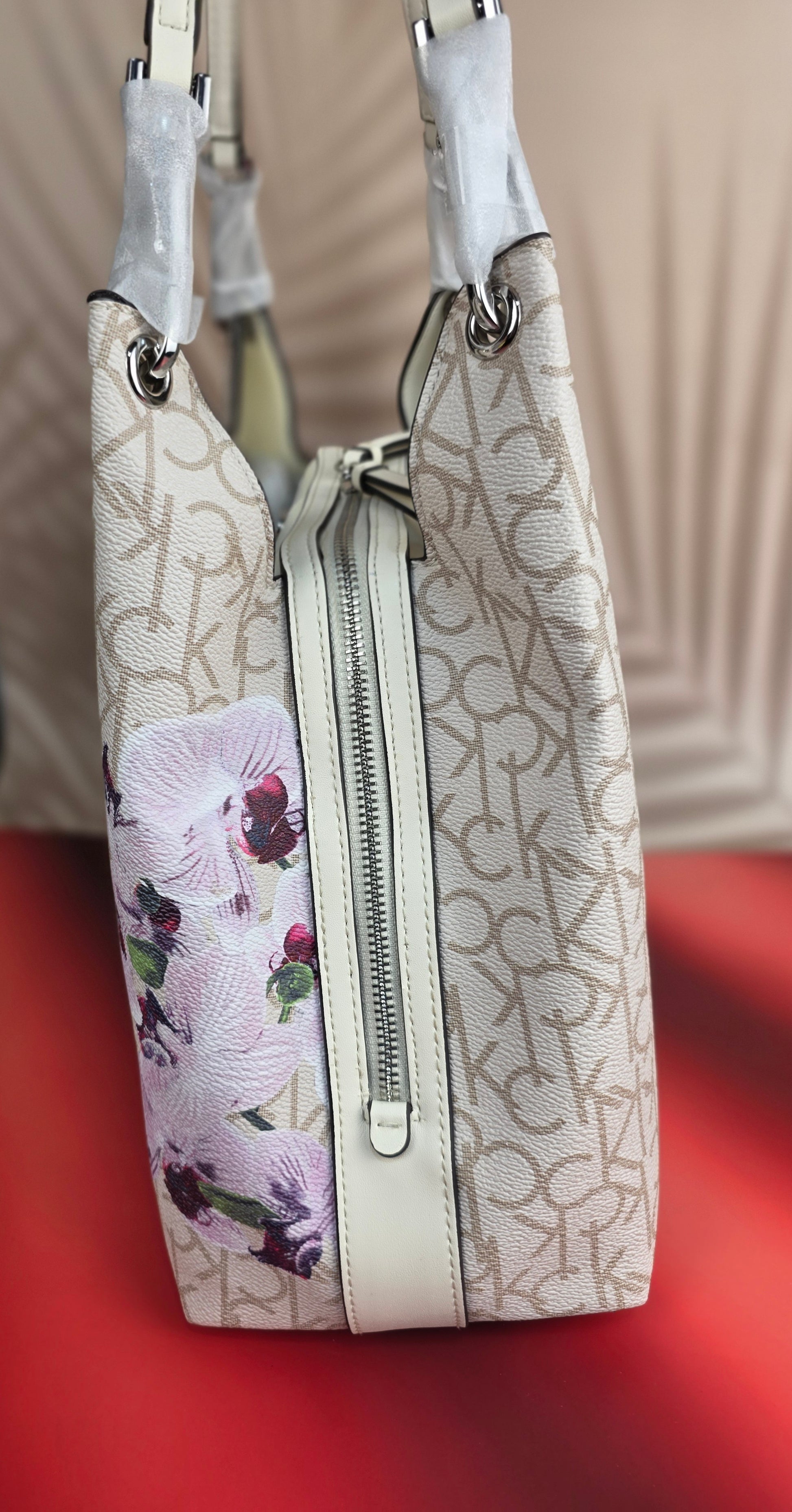 Calvin Klein hobo bag in beige with all-over “CK” monogram print. Features floral accents in pink and purple for a feminine, elegant touch. Includes shoulder strap, spacious interior, and silver-tone hardware. Perfect for a modern, sophisticated look.