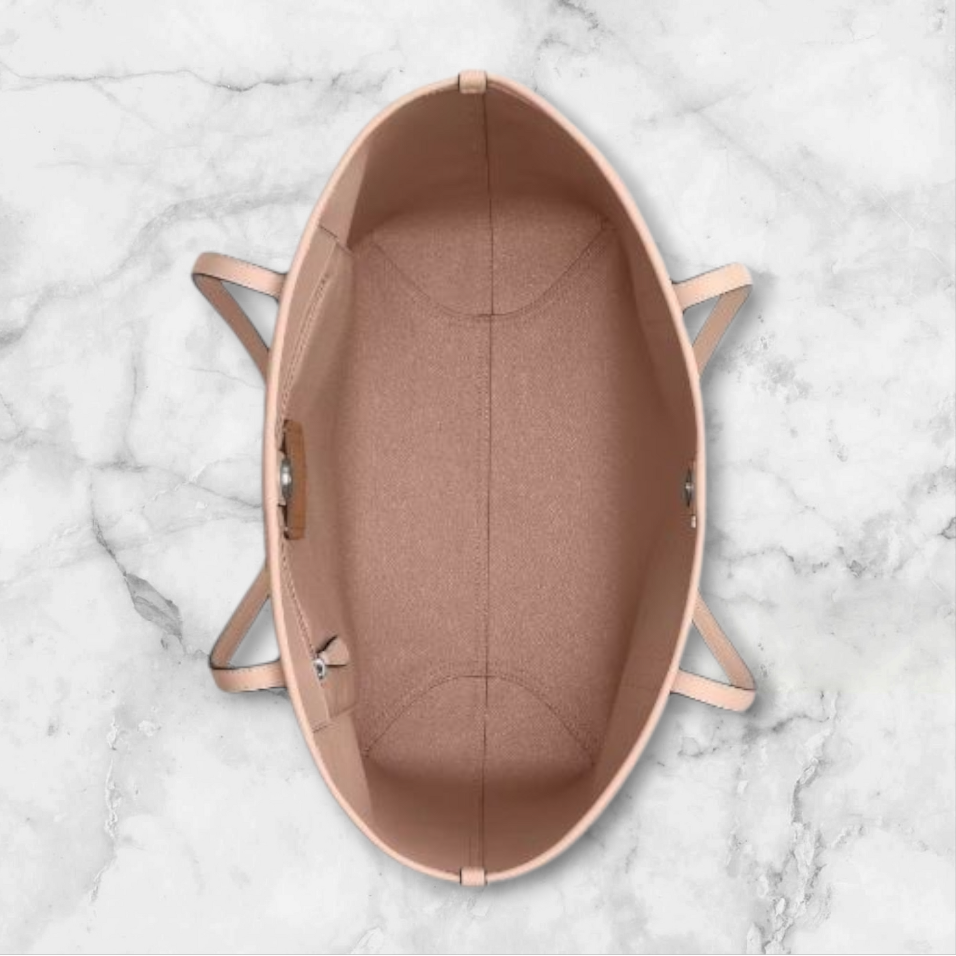 Coach tote bag in beige with signature monogram print. Features long pink leather handles, spacious interior, and signature logo tag. An elegant and versatile design, perfect for daily use or to complement a modern, sophisticated look.