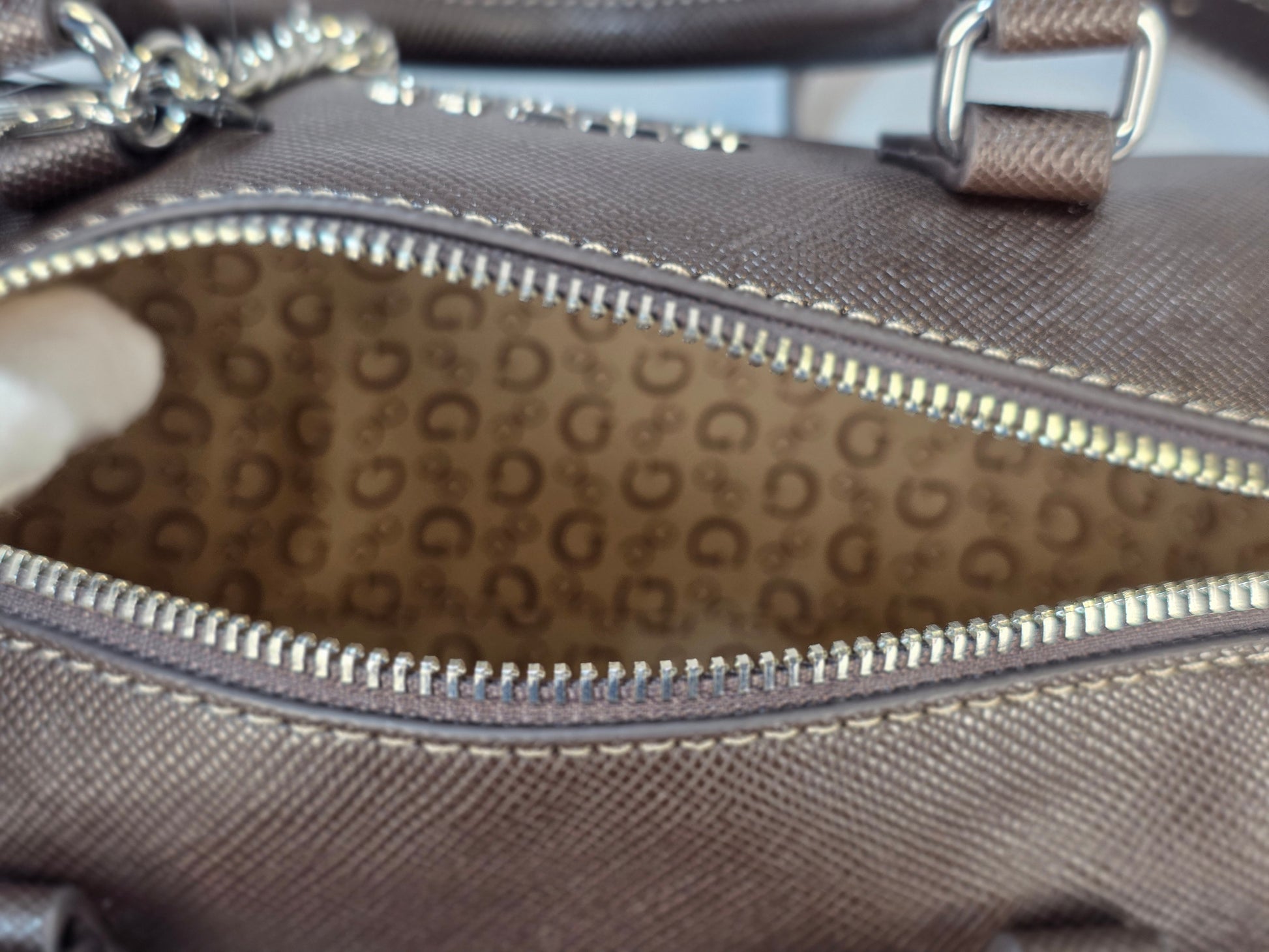 GUESS satchel bag in navy blue with textured finish. Features top handles, adjustable/removable strap, zip closure, and silver-tone hardware. Includes a metallic logo charm with brand pendants. Elegant and modern, perfect for any occasion.