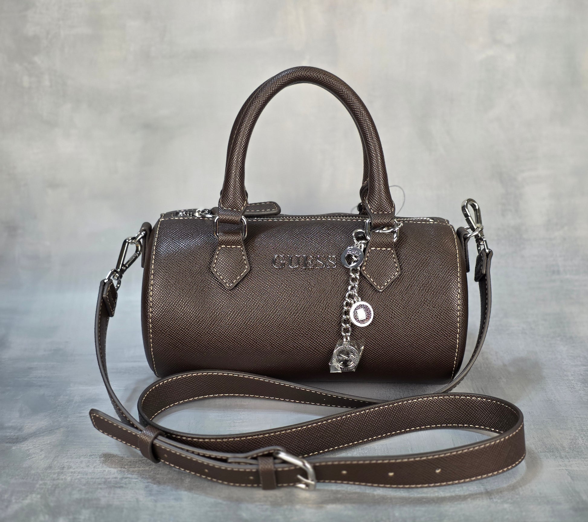 GUESS satchel bag in dark Chocolate with textured finish. Features top handles, adjustable/removable strap, zip closure, and silver-tone hardware. Comes with a metallic logo charm with brand pendants. Elegant, compact, and versatile—ideal for any occasion.