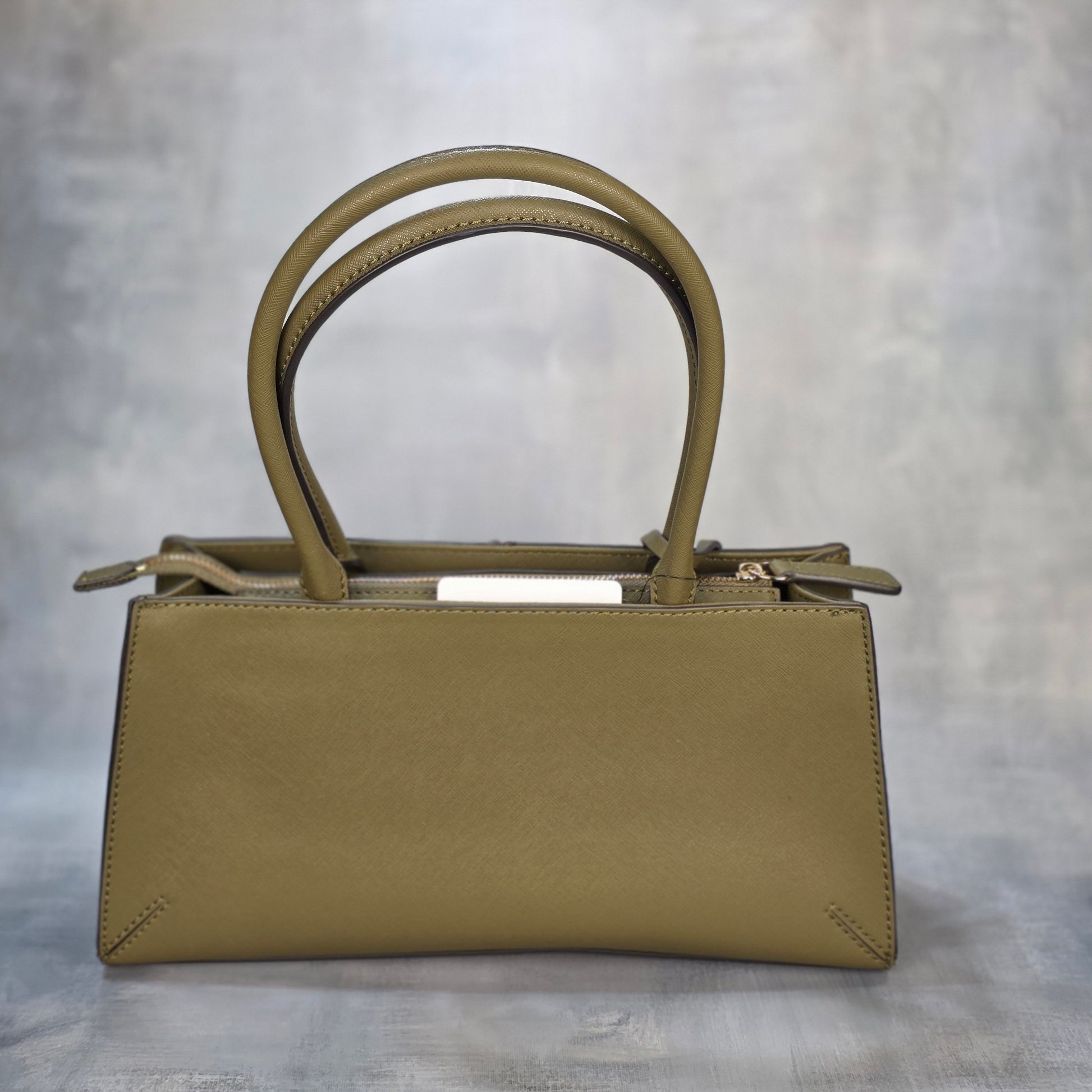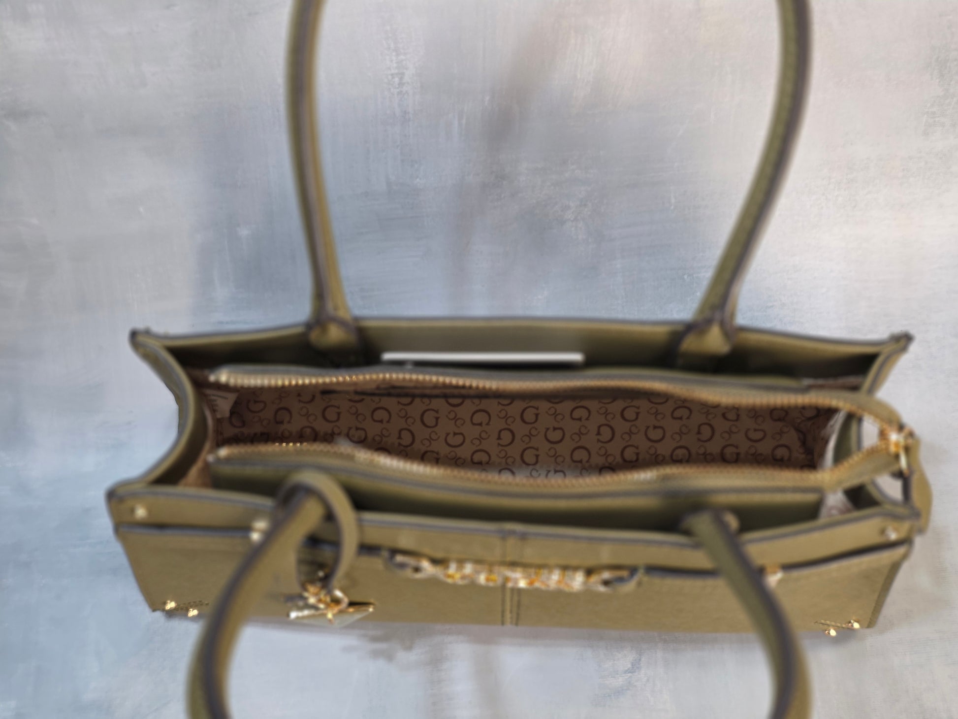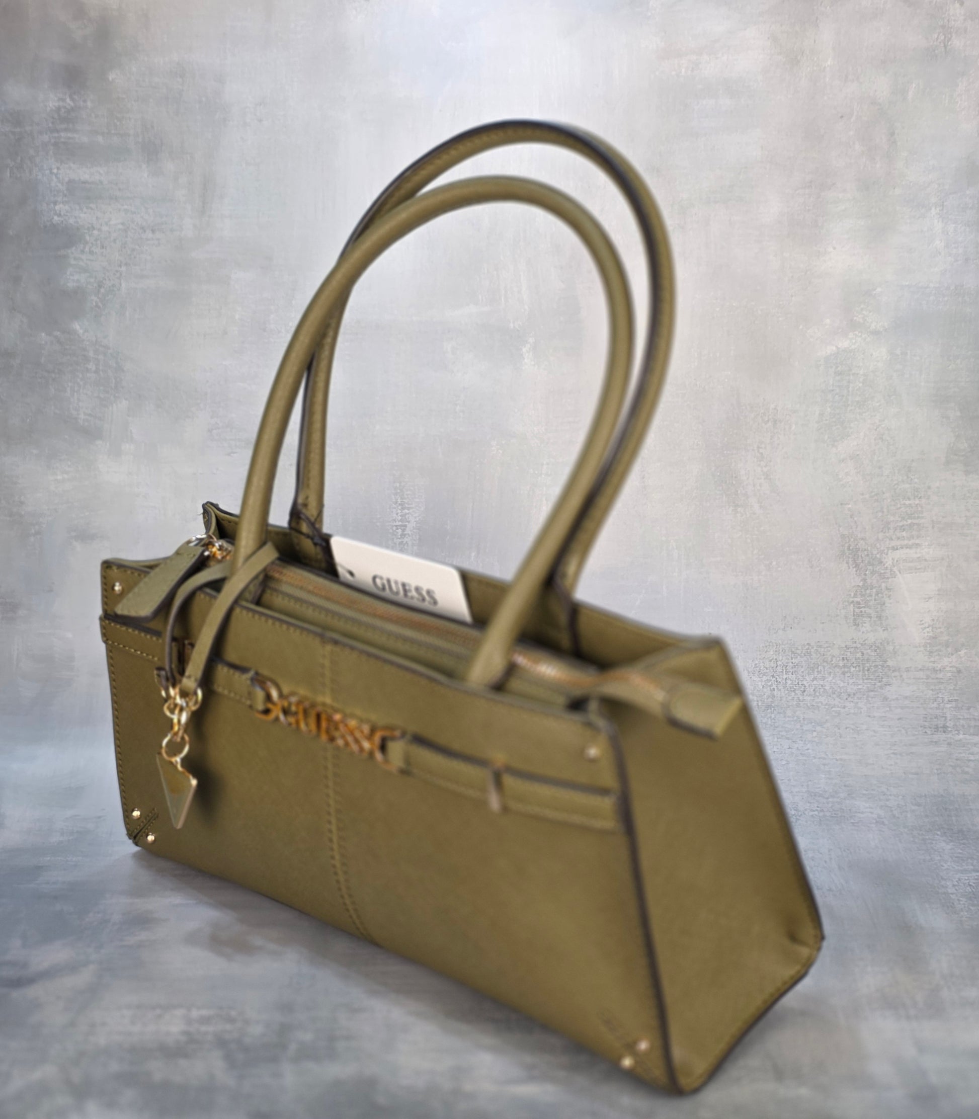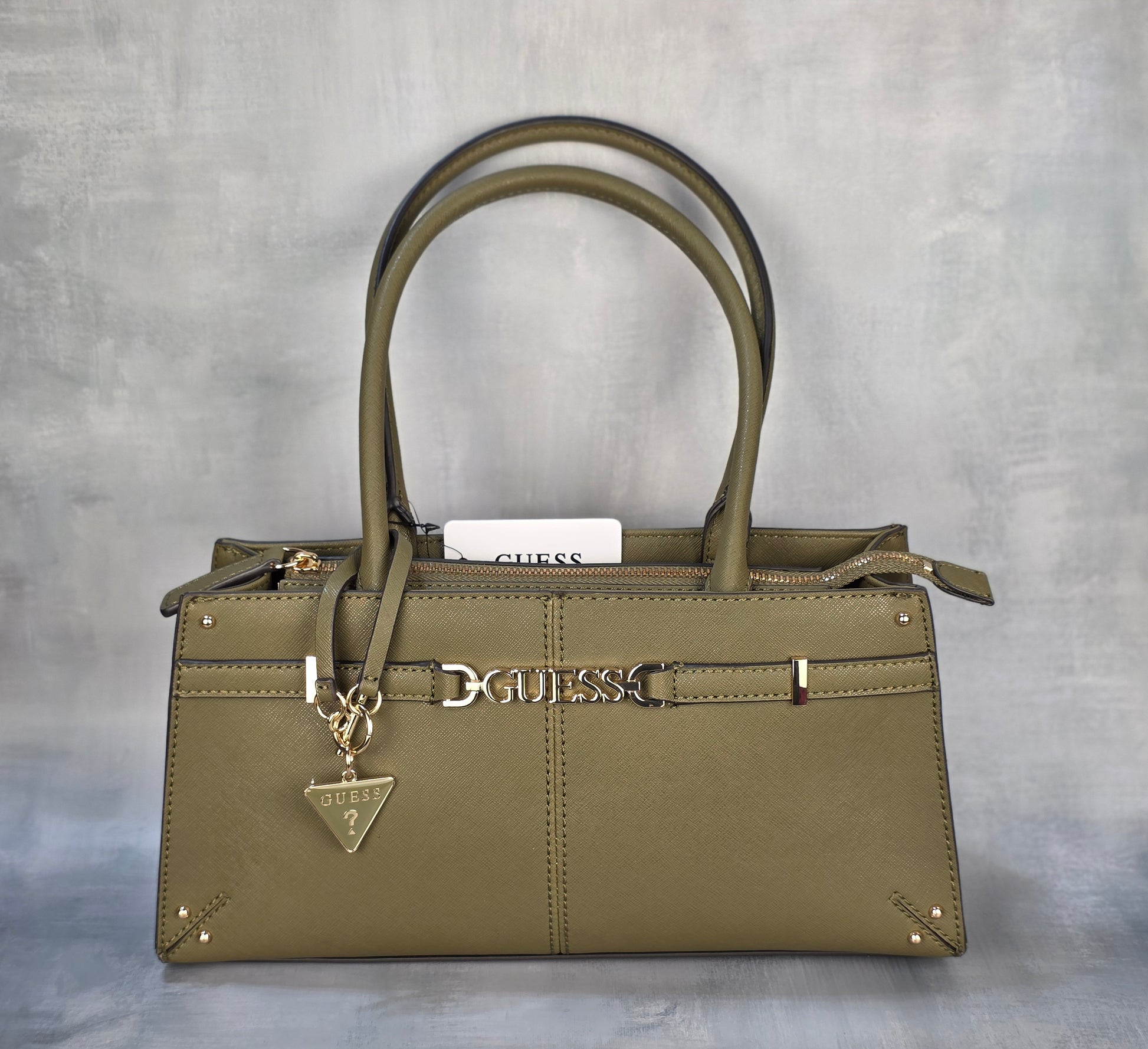 GUESS handbag in olive green with a structured and elegant design. Features top handles, zip closure, gold-tone hardware, and a signature triangular logo charm. Modern and sophisticated, it’s the perfect accessory to stand out on any occasion.