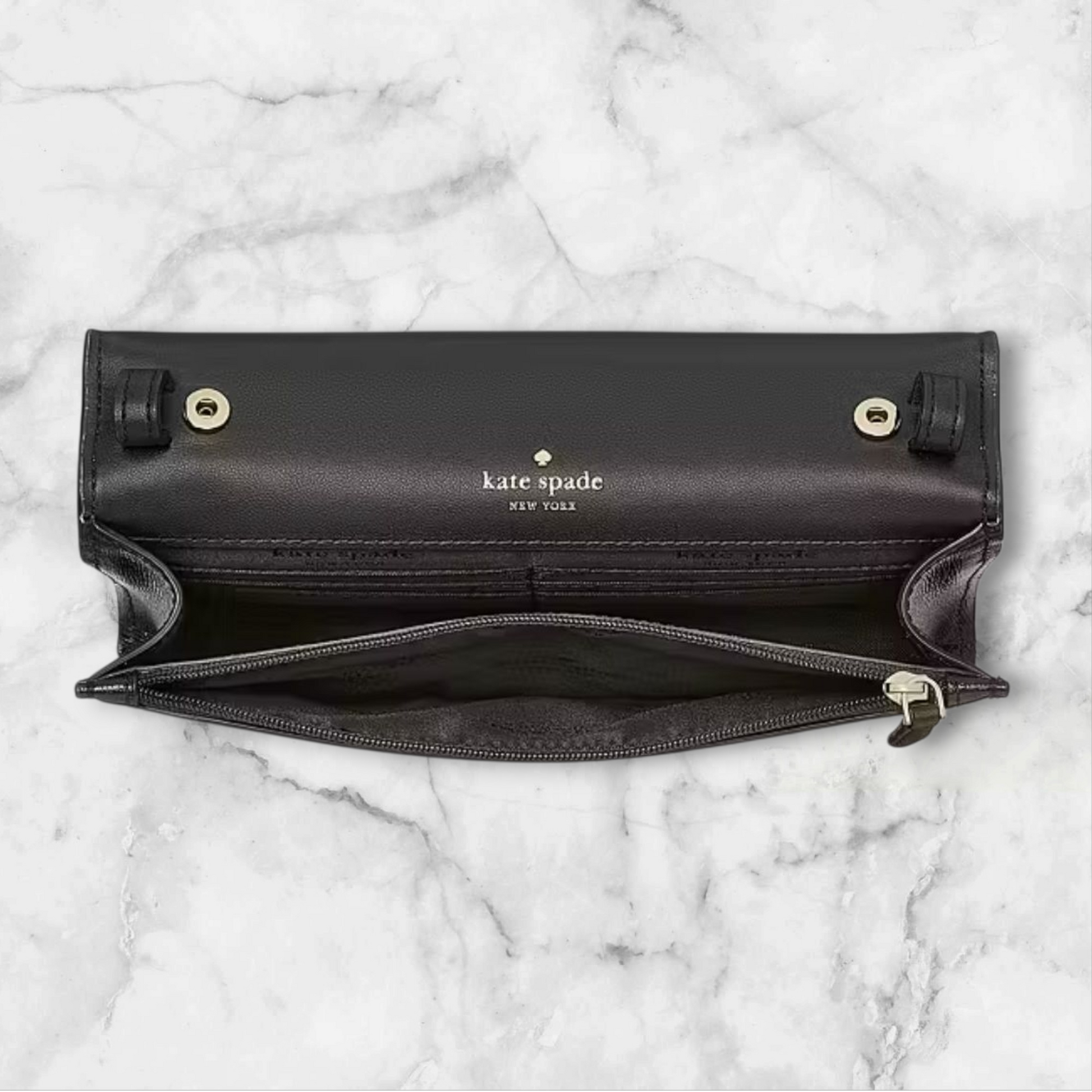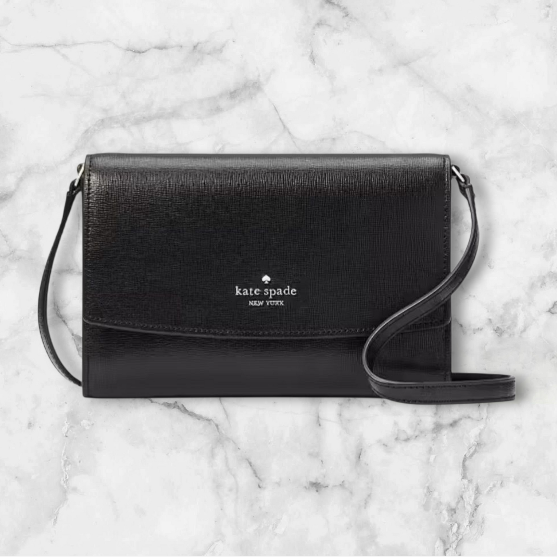 This Kate Spade crossbody bag in black is crafted from smooth pebbled leather, featuring a sleek rectangular shape with a flap closure. The adjustable shoulder strap and silver-toned hardware add a touch of elegance, making it a versatile choice for both casual and formal settings.