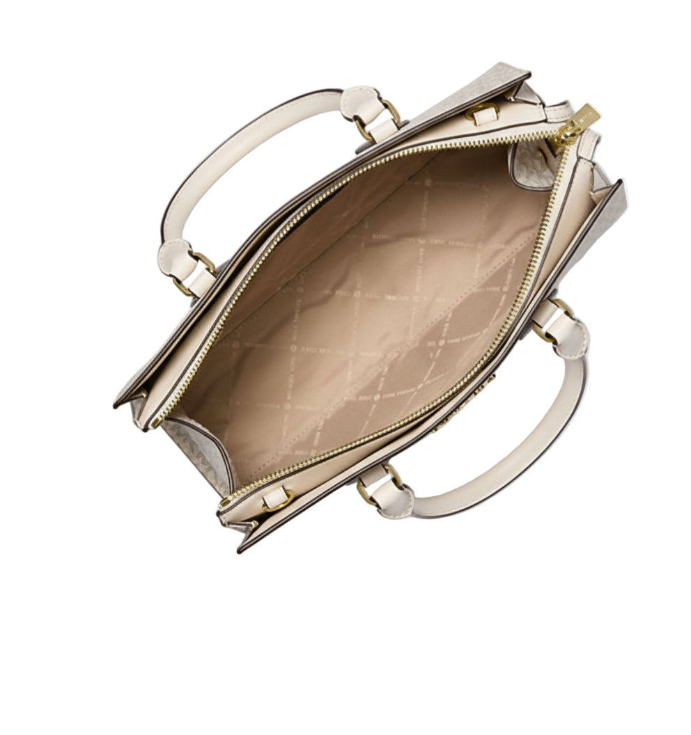 Elegant and versatile Michael Kors handbag crafted from canvas with the iconic beige MK print. Features reinforced top handles, an adjustable strap for shoulder or crossbody wear, and gold-tone hardware for a sophisticated touch. Its spacious interior makes it the perfect choice for carrying your daily essentials in style.