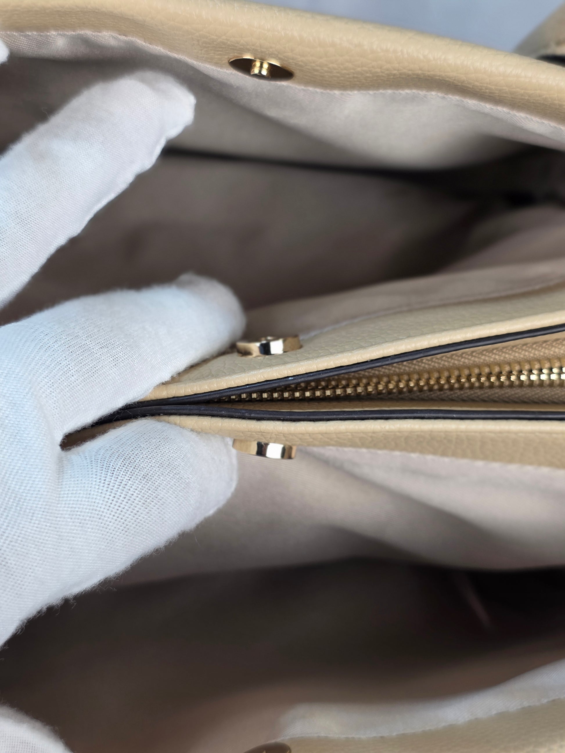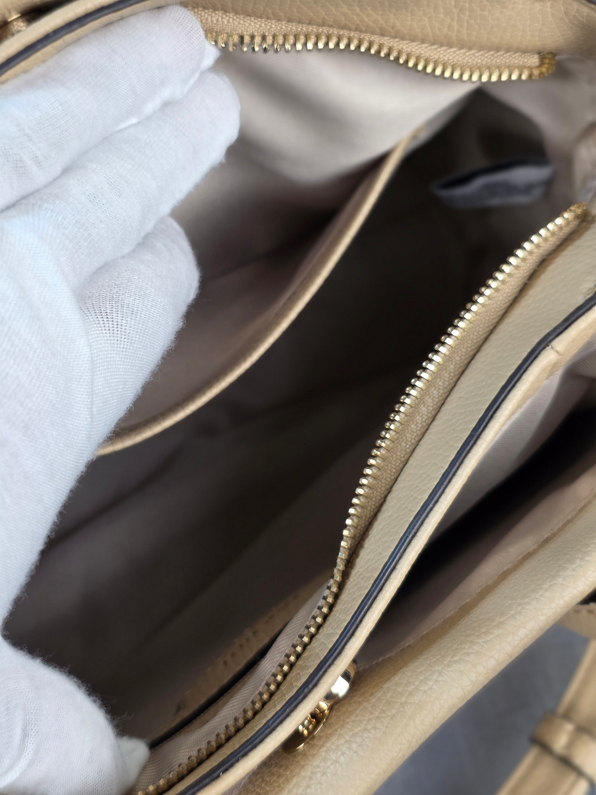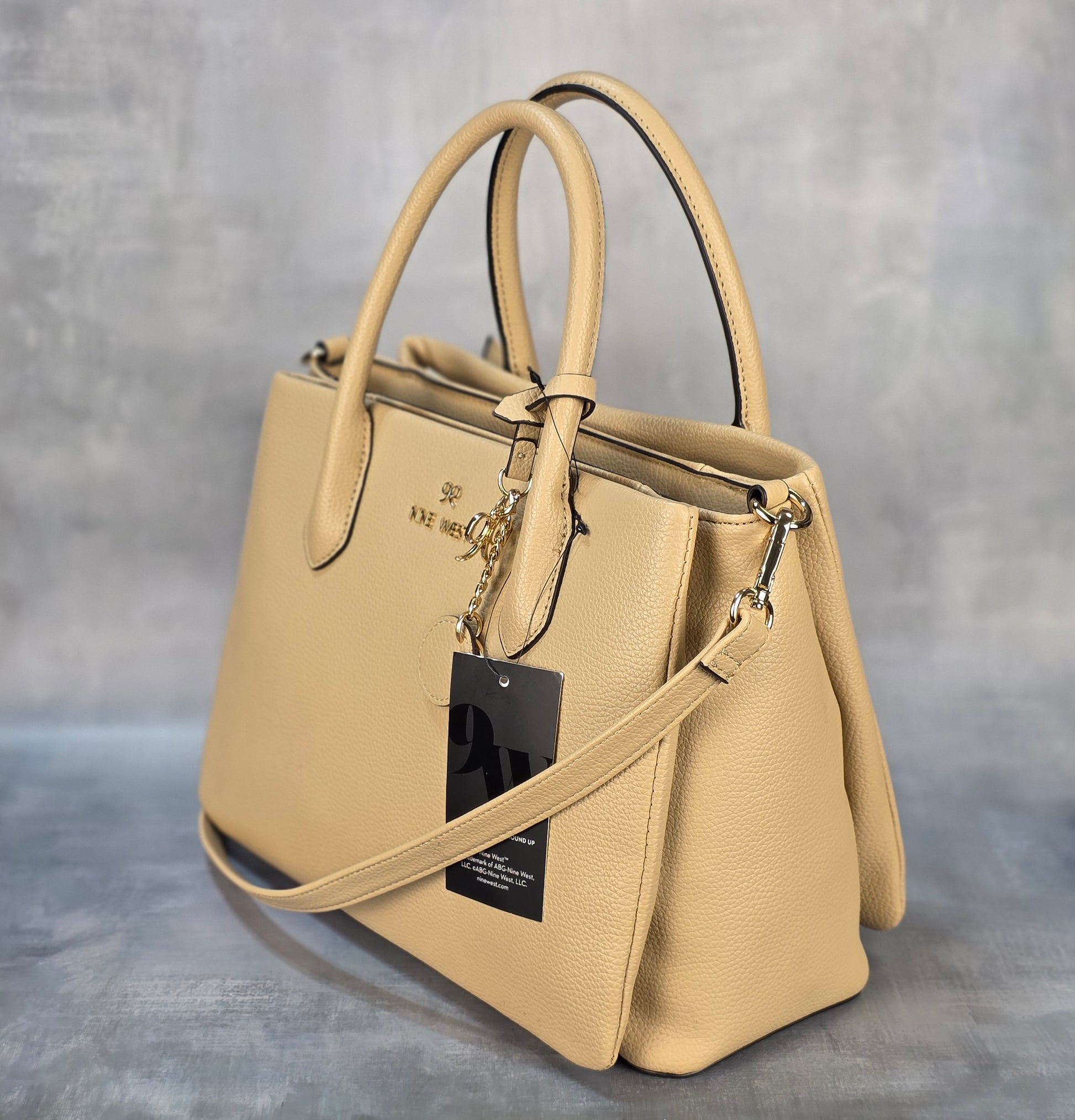 Nine West handbag in elegant beige with textured finish. Features dual top handles, adjustable/removable strap, gold-tone hardware, and a decorative charm. Spacious and versatile, ideal for daily use or to complete a sophisticated look with modern style.
