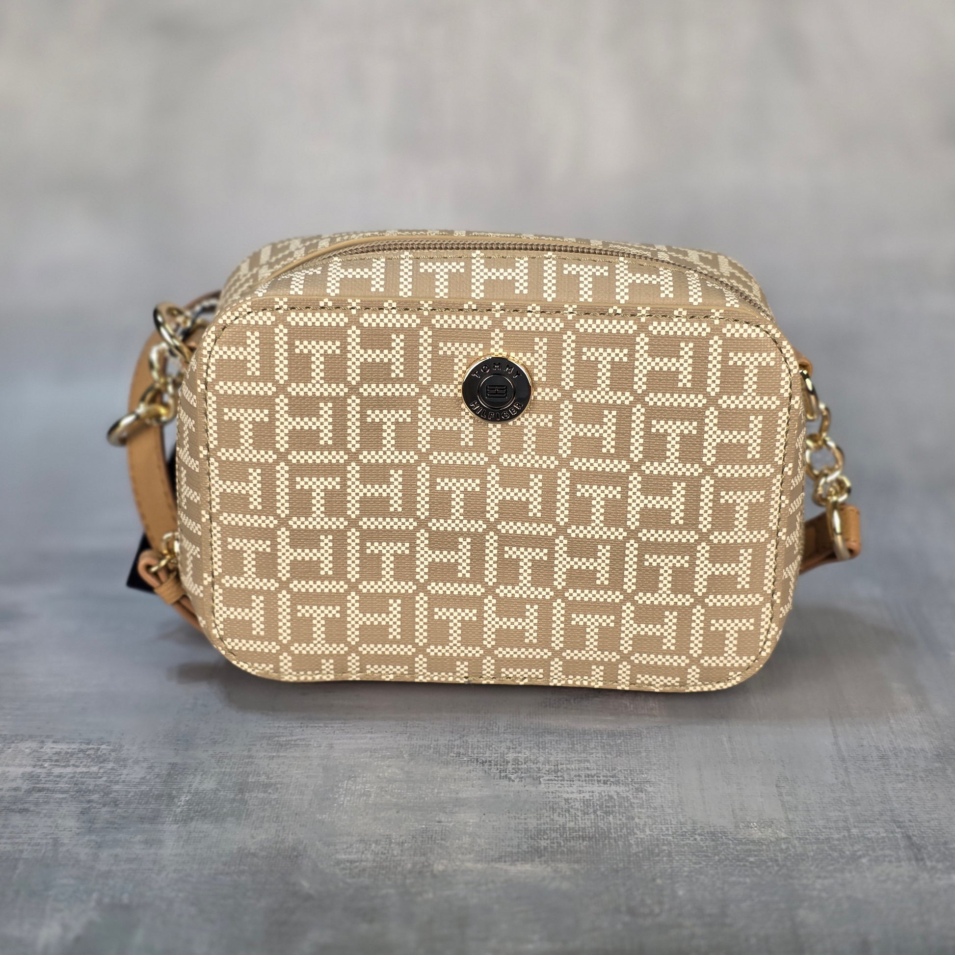 Tommy Hilfiger crossbody bag in beige with all-over “TH” monogram print. Features an adjustable strap with gold-tone details and top zip closure. A stylish, versatile, and modern accessory, perfect to elevate any outfit with the brand’s iconic touch.